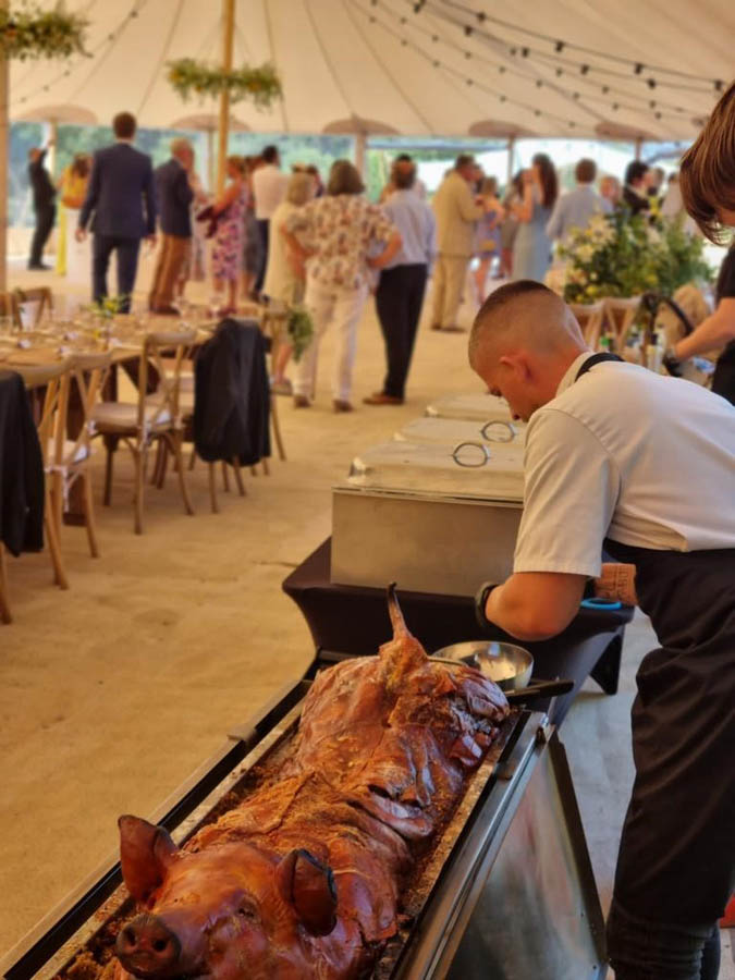 Our pre-wedding hog roast dinner at Euridge Manor, catered by Spitting Pig, was a great addition to our wedding weekend festivities! The food was incredible—perfectly cooked, flavorful, and plentiful. There was so much left over that we were able to enjoy it as a post-wedding midnight snack the following day, which was a real treat.